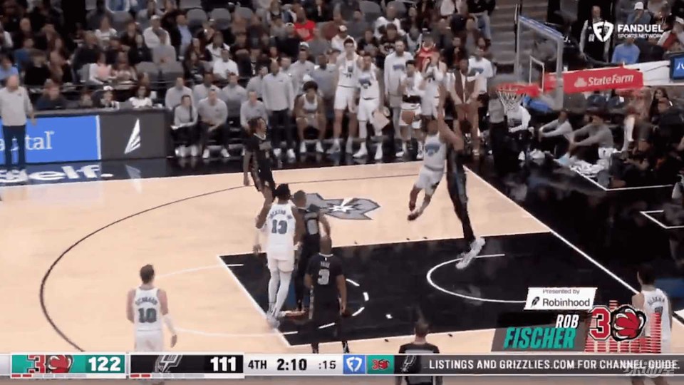 贾·莫兰特又展现了他标志性的精彩表演。他完成了一记标志性的暴扣,这次的对象是7尺3寸的天才新秀维克托·文班亚马。这次扣篮是在哨响之后完成的,无效。